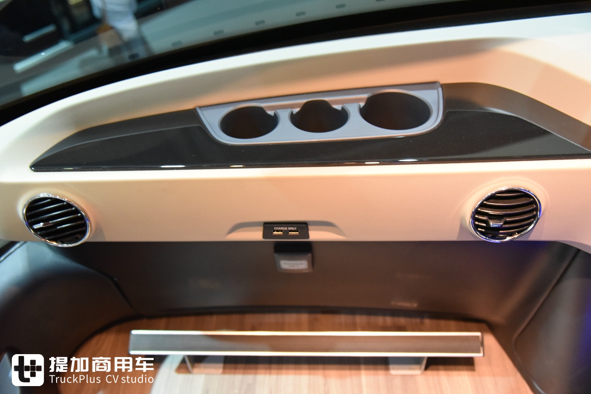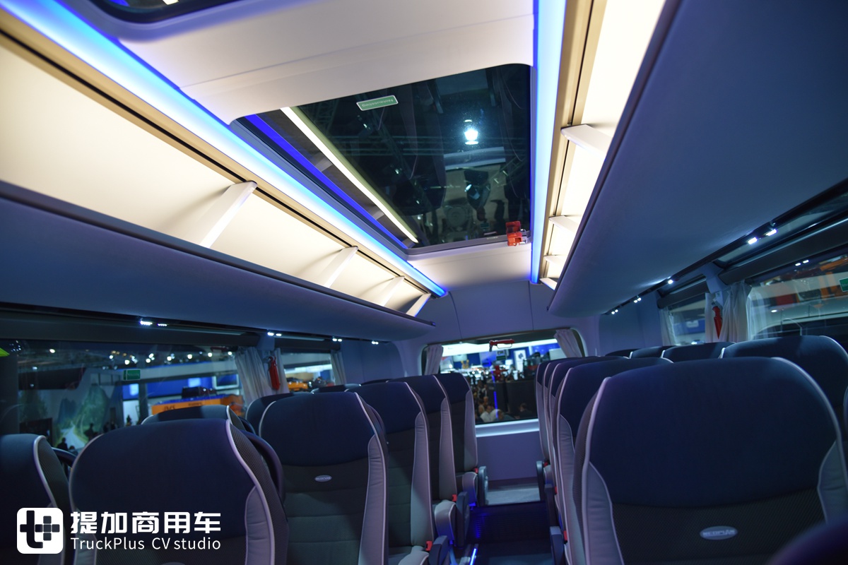 尽管一层座舱垂直高度为1.68m,但是在特有灯光的映衬下因高度所产生的局促感顿时全无。展车上下层可以容纳77名旅客,设计最大容纳旅客数量为83人。