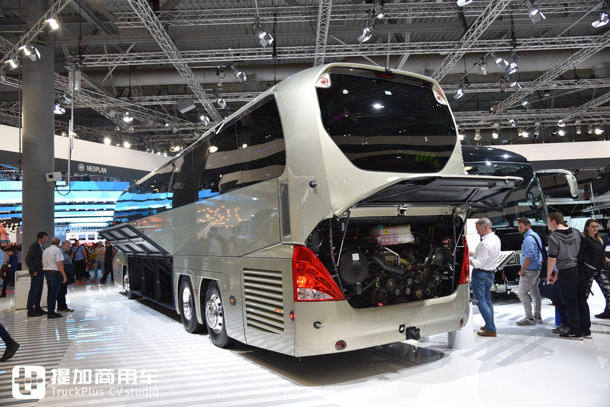 本次车展NEOPLAN带来的Skyliner N1222/3L车型,采用黑底分体式氙气灯+LED灯组设计,从外观方面就给予乘客极强的视觉感受。现场资料显示,这款车车身长度为14米,宽度2.5米,高度则高达4米。