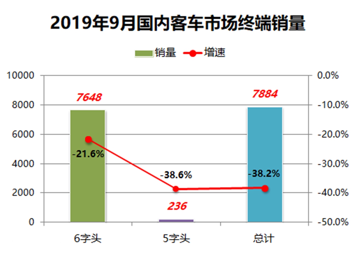 2019年9月,国内客车市场终端共销售7884辆,同比下降38.2%,环比下降42.8%,双降的态势和下降幅度之大,也与中国汽车工业的寒冬期一致,整体陷入低迷期。具体:6字头基本型客车销售7648辆,同比下降21.6%;5字头专用类改装客车销售236辆,同比下降38.6%,整体占比只有3%。正如笔者在此前文章有述,5字头始终不是客车的主流,由于销量极小,故在下文中也不再将其纳入分析范畴,请读者明确和牢记。