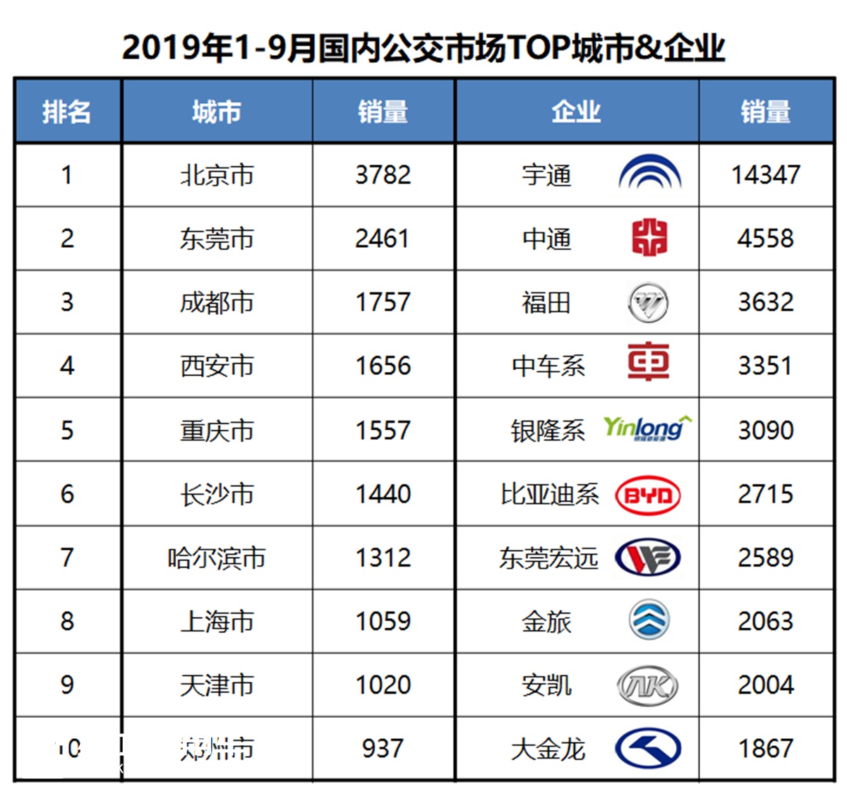 从主销城市来看,七个大区均有城市入围,四大直辖市均有上榜,能够入围的城市基本需要千辆的销售规模,500辆以下的单一订单在当前的国内公交市场已属普通水平。东莞市接替广州市,成为华南地区最大的公交城市,但主要受益者是几乎清一色的东莞宏远。西南地区的成渝均有较大销售规模,重庆市近期启动了2019年度招标计划,引发客车企业的侧目,中车收购重庆恒通也有很深的市场订单意味。较为意外的是东北地区的哈尔滨市以1312辆当选,这主要得益于三个季度稳定的销量。