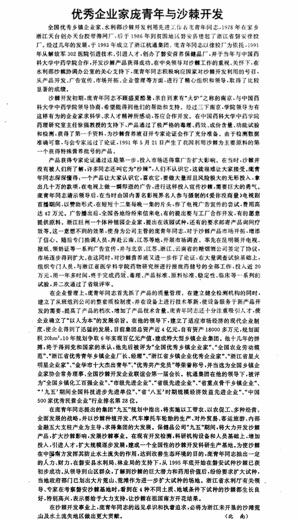 附赠一篇1996年12月《沙棘》杂志刊登的文章《优秀企业家庞青年与沙棘开发》,广大读者也了解一下庞青年先生在进入汽车制造业之前的发展历程。