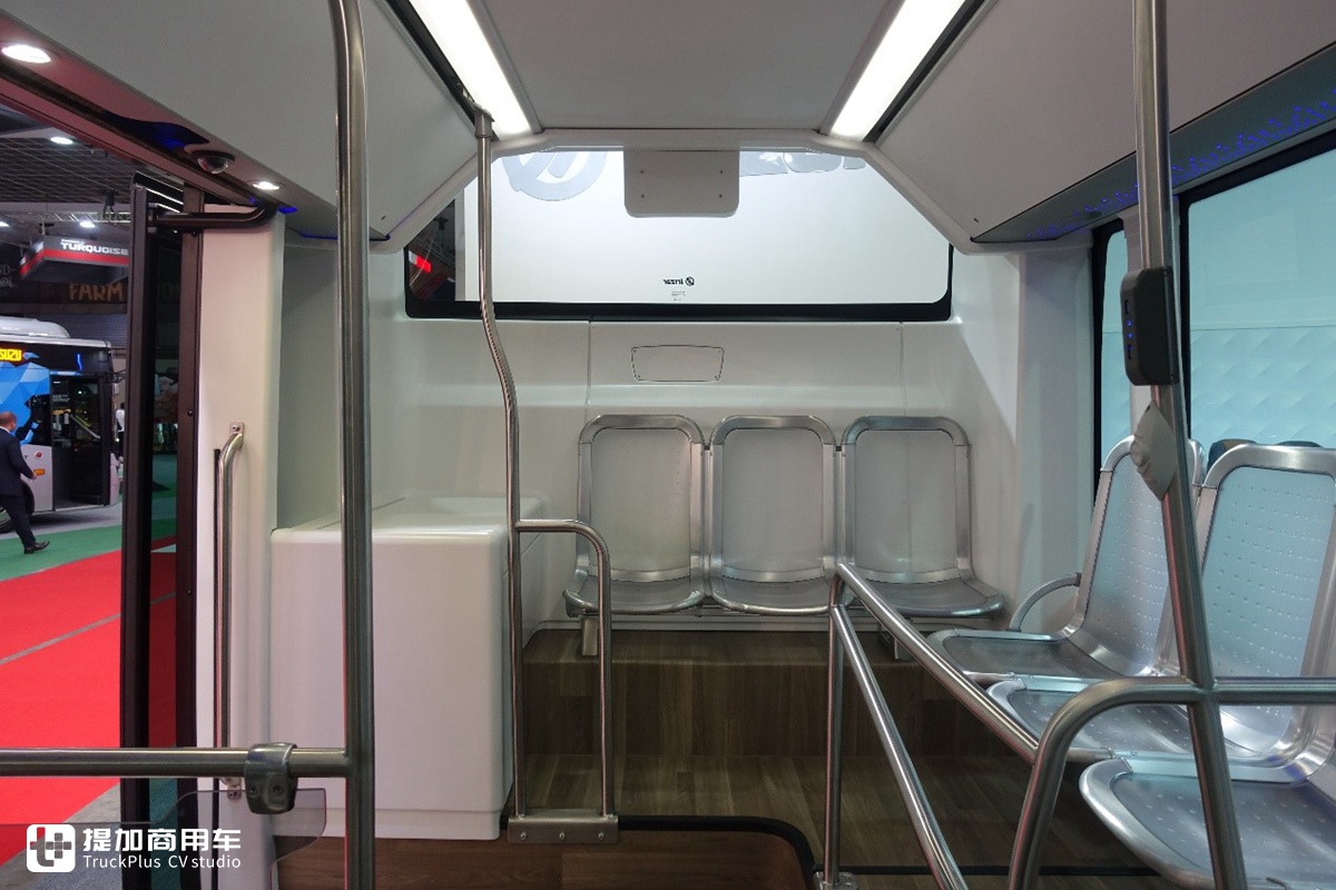 在内饰的设计上采用了“露天”的设计思维。落地的车窗玻璃,无数LED灯带拼凑而成的“天空”车顶,旨在提供一个开放的乘车环境,能使车内乘客与外界能近一步的拉近距离,方便乘客观察车外的情况,将乘客带入到宽敞、舒适和安全的环境中去。并提供了USB接口、车载WIFI、行李架和报刊栏等点配装置供客户选装。