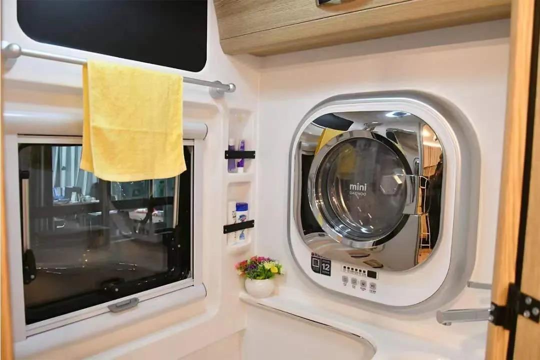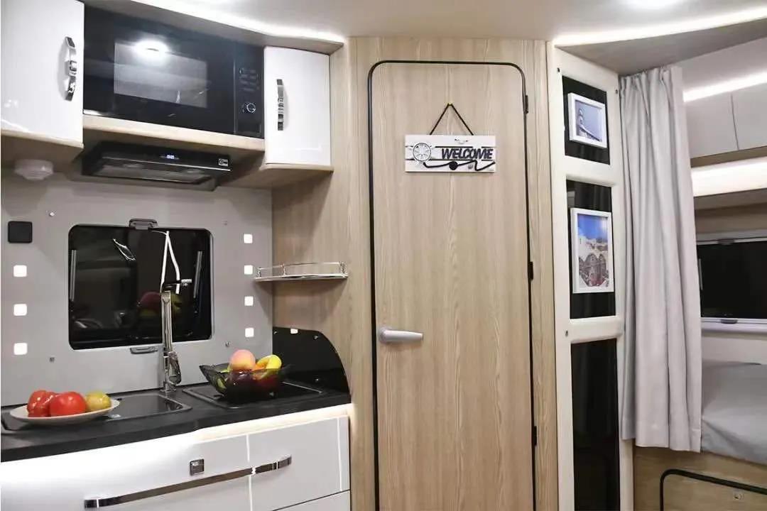 一体式厨房位于车厢右侧,储物柜、微波炉、油烟机、五孔插座、电磁炉、带盖水槽等配置较为常规。车门上方为车辆中控区,下方还设计了一个带盖垃圾桶。