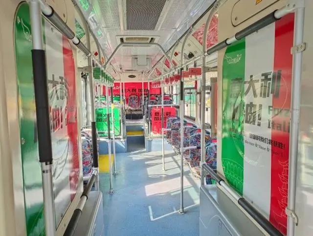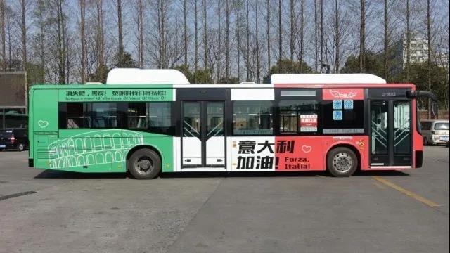 本周起公交集团将推出一辆专属车身公益广告,取意大利代表性的红白绿三色为底色,并附有三潭印月、罗马斗兽场等地标建筑图案,大大的“意大利,加油!”口号,印着中意两种语言,并在显著位置附上了象征中意文明交流的意大利歌剧《图兰朵》的歌词:消失吧黑夜,黎明时我们将获胜。车内的拉手、扶杆、椅背等也随处可见杭州人民对意大利的衷心祝愿和激励鼓舞。