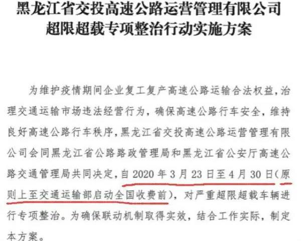近日,黑龙江省交投高速公路运营管理有限公司发布的一个行动方案中表示:“自2020年3月23日至4月30日(原则上至交通运输部启动全国收费前),对严重超限超载车辆进行专项整治。