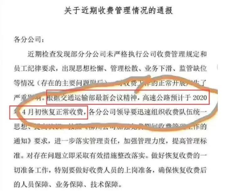 另一份《关于近期收费管理情况的通报》文件显示,根据交通运输部最新会议精神,高速公路预计于2020年4月初恢复正常收费。