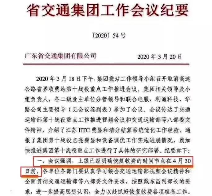 3月18日下午,广东省交通集团撤站工作领导小组召开取消高速公路省界收费站第十战役重点工作推进会议内容。其中,会议第一条就强调上级已经明确高速公路恢复收费的时间在4月30日之前。
