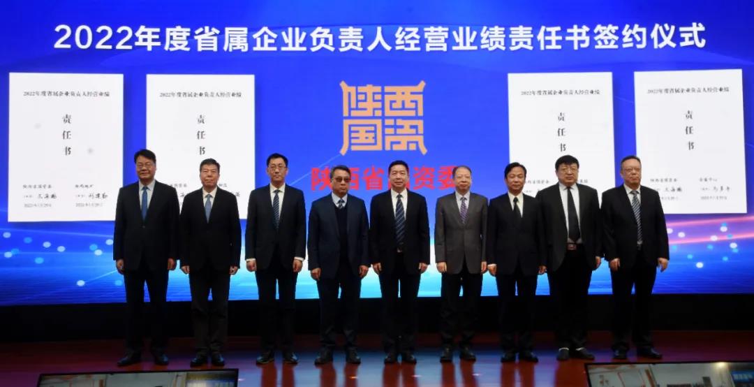 严鉴铂代表企业签署2022年度省属企业负责人经营业绩责任书。法士特集团领导班子成员在西安高新厂区参加视频会议。