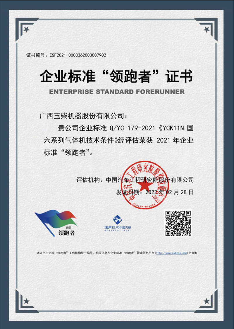 近日,玉柴凭借企业标准Q/YC 179-2021《YCK11N国六系列气体机技术条件》荣获2021年企业标准“领跑者”证书。