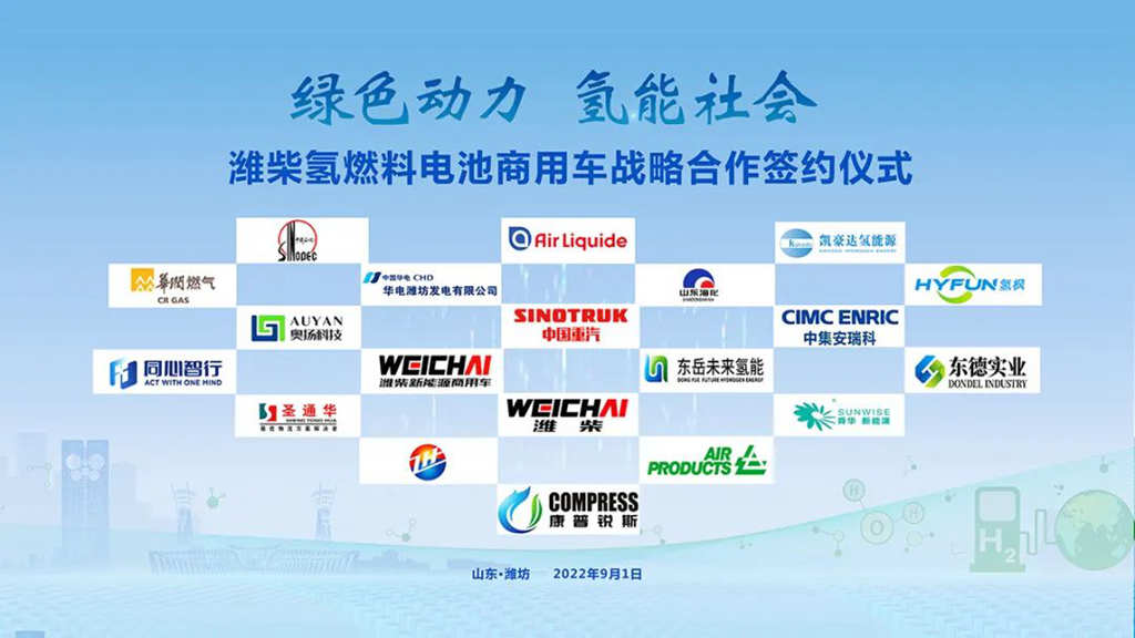 2022年9月1日上午9:00,以“绿色动力 氢能社会”为主题的潍柴氢燃料电池商用车战略合作签约仪式在山东潍坊举行。继8月27日200辆氢燃料电池商用车运营交接之后,潍柴再次签下1100辆大订单,按下了氢燃料电池更大规模、更多场景商业化应用的“加速键”。