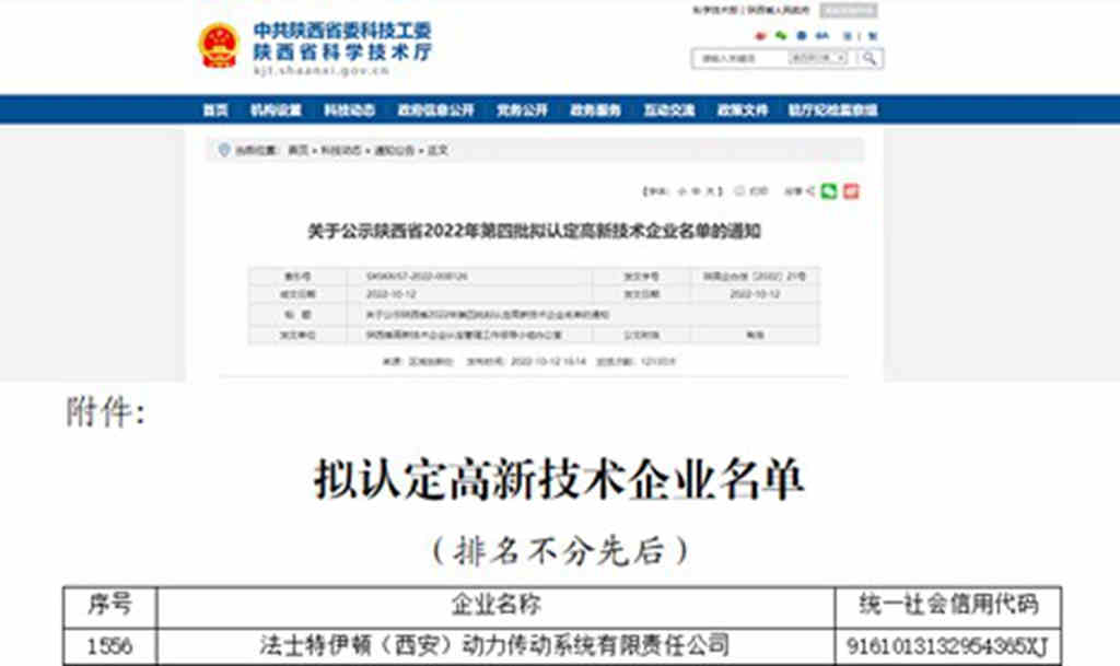 近日,陕西省科学技术厅发布了《关于公示陕西省2022年第四批拟认定高新技术企业名单的通知》,法士特伊顿(西安)动力传动系统有限责任公司入选该名单。