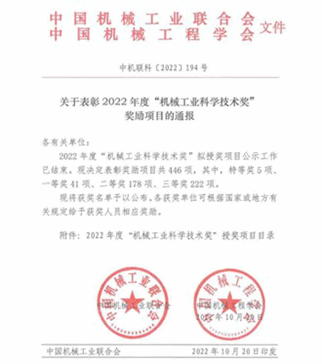 日前,中国机械工业联合会、中国机械工程学会联合发布了《关于表彰2022年度“机械工业科学技术奖”奖励项目的通报》。