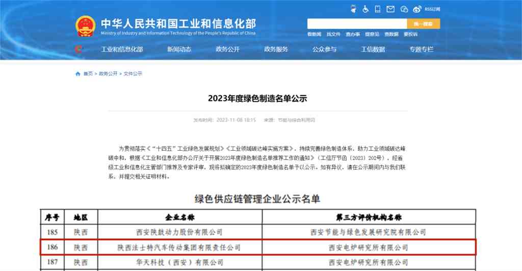 日前,国家工信部节能与综合利用司发布《2023年度绿色制造公示名单》,陕西法士特汽车传动集团有限责任公司入选国家级绿色供应链管理企业。