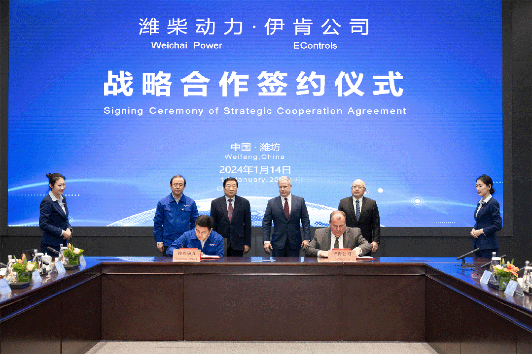 潍柴动力CEO、总经理王德成与EControls公司执行副总裁、总工程师麦克·沃尔瑟代表双方签署战略合作协议。