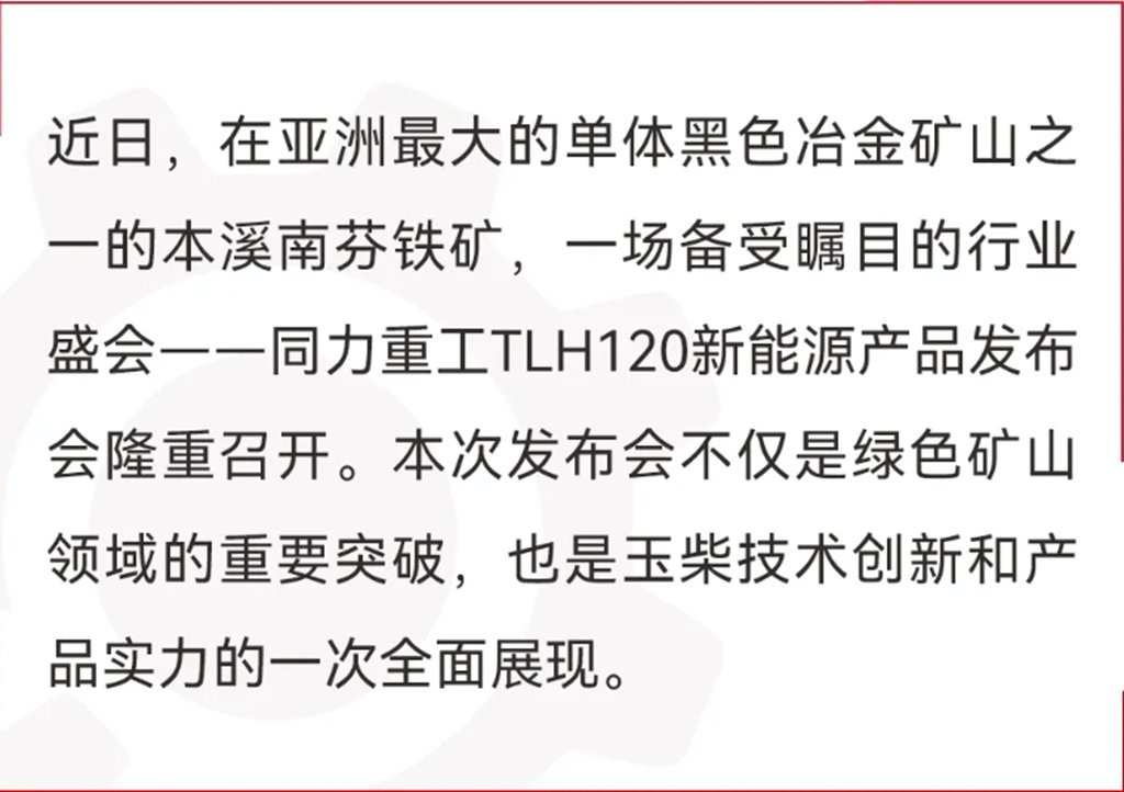 据悉,早在2024年初,四十余台配套玉柴增程器的同力重工TLH105气电增程产品进驻本钢南芬铁矿,经过高强度长时间的矿山应用考验,成功验证了TLH105产品在经济效益和社会效益方面的卓越表现。用户和矿方都对产品的可靠性和经济性给予了高度评价。
