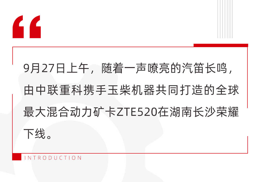 ZTE520混合动力矿用自卸车的荣耀问世,打破了国产大吨位矿车对进口大马力发动机的技术壁垒,为客户提供了更高效、可靠的动力解决方案,不仅展现了中联重科在矿山机械领域的技术实力,也展现了玉柴在大马力发动机领域的自主创新能力,为大吨位矿车动力系统和国产化矿用机械的全球化发展奠定了坚实基础。