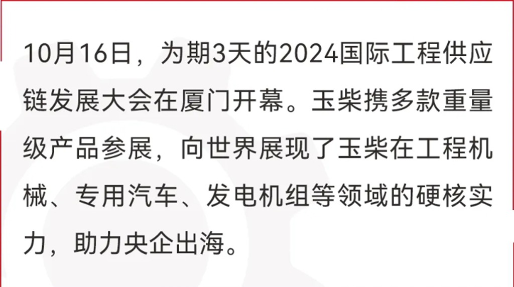 玉柴将充分利用此次大会的契机,加强与国内外同行的交流与合作,共同探索绿色供应链、可持续发展等前沿议题,为推动国际工程供应链的高质量发展贡献力量。