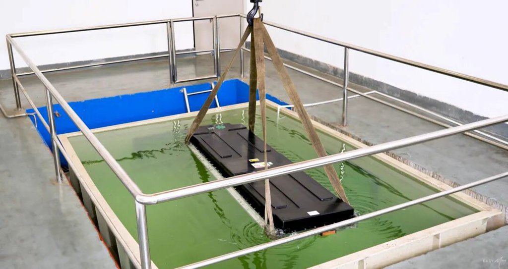 在浸水测试中,爱易科动力电池采用大法兰面密封+FSW焊接的技术,具有分子级防护耐高压、耐高温、耐腐蚀的良好性能。在测试场景上,爱易科电池在1.5米深的3.5%高浓度盐水中持续浸泡72小时,而新国标仅要求2小时浸没即可。考虑到今年北方地区多雨的特点,良好的耐水性不仅让用户无惧积水潮湿的路段,就算涉水也仍能保持电池的稳定安全,爱易科动力电池将安全隐患排除在出厂前的每一个环节。