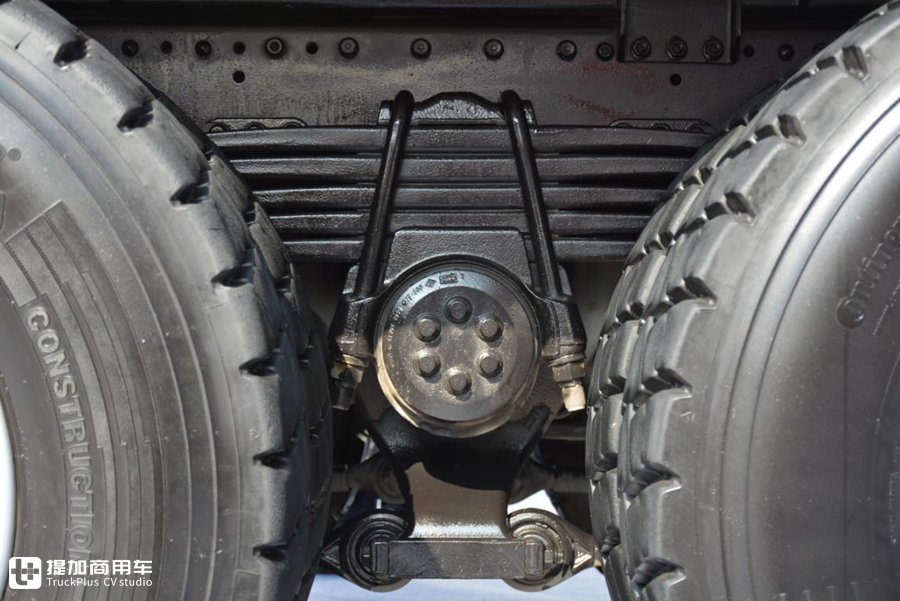 后桥安排上了 MAN的轮边减速桥,车轮同样是315/80R22.5的规格,只是选用了驱动能力较强的块状花纹轮胎。后桥的板簧数量为五片,并且采用单斜拉式起码卡设计。