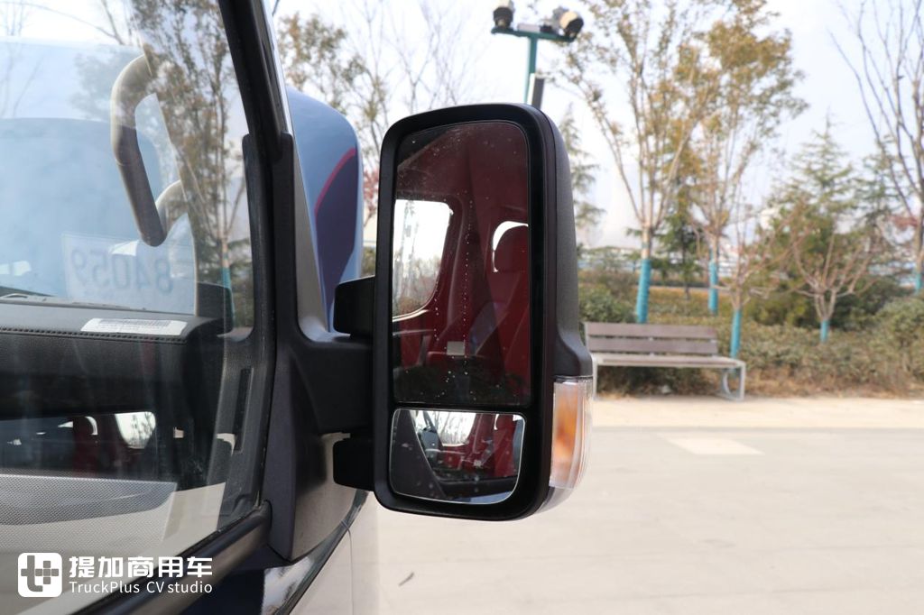 后视镜为一体式镜壳,上面带有示廓和转向灯,后视镜支持选配电动调节,内部集成双曲率镜片,减小车辆后方与下方视线盲区。