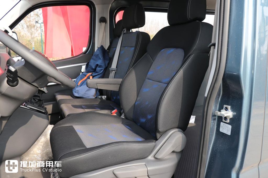 驾驶员每天接触最多的就是座椅和方向盘,为确保舒适性,东风御风V9+采用了包裹感更强的运动座椅,侧翼和坐垫支撑性更好,贴合人体曲线,坐垫高度和靠背角度大幅度可调整区间,且带有右臂臂托设计,大大提升了驾驶员的舒适性。