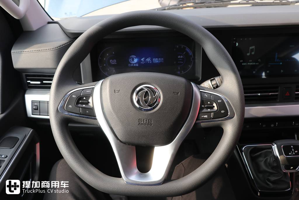 其次,方向盘采用的是轿车化设计,小巧玲珑的外圈尺寸加上平底带指握的造型,不论是握感还是操控性都非常棒。在方向盘中间集成有定速巡航、仪表控制和蓝牙多媒体的控制按键,驾驶员双手不离方向盘即可完成所有操作。