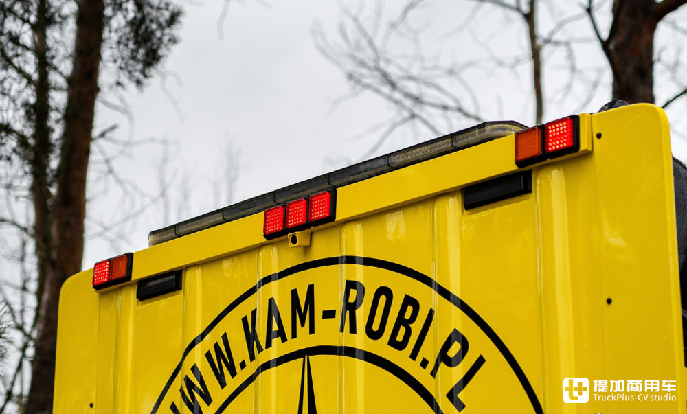 生活舱后面大大的空间怎么能浪费呢?在后墙之上,车辆喷涂了奔驰三叉星徽以及Kam-Robi公司网站,并安装了两枚备胎、高位照明灯及刹车灯。