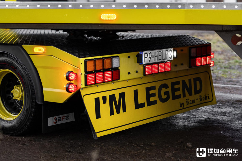 定制的复古风格车尾保险杠上安装有若干枚方形灯光,起到刹车灯、转向灯及倒车灯等作用。下方的挡泥板上带有“I‘M LEGEND“字样,翻成中文就是:我是传奇。