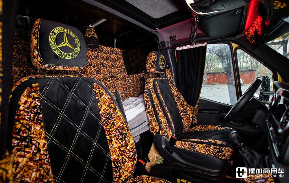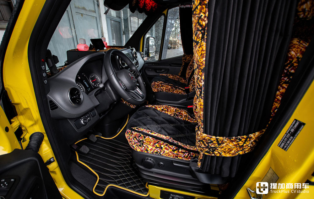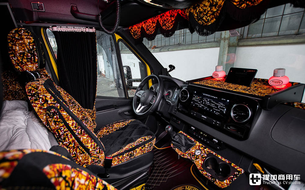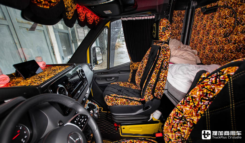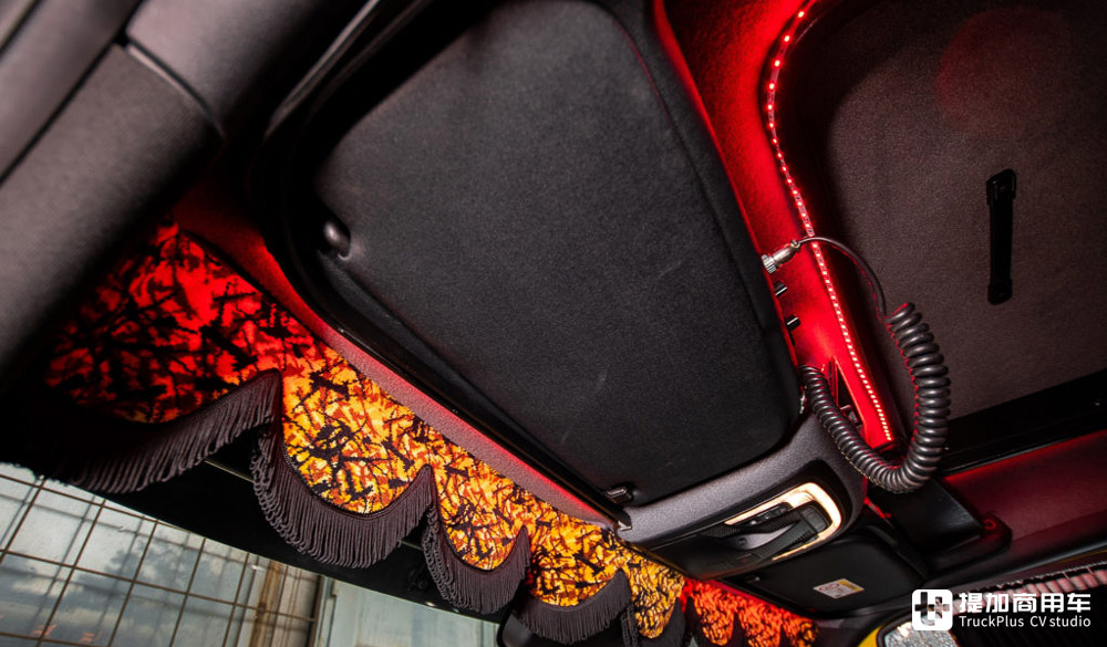 打开驾驶室,你则会被其内饰设计所震惊。整个驾驶室都进行了重新包覆,新增的花纹图案彰显了公司个性,不过看着确实有点乱。此外,驾驶室内还新增了脚垫及加厚窗帘,提升内部的舒适度。