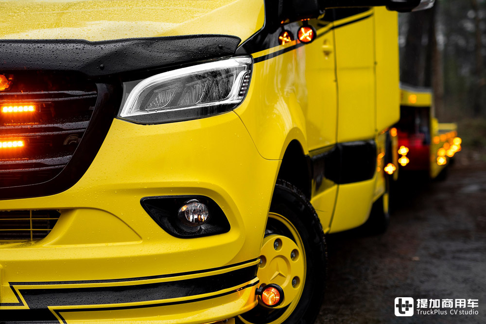 前中网以及奔驰三叉星LOGO都进行了熏黑,并且格栅内部增加了照明灯及爆闪灯。在灯光改装中,改装厂遇到了几个小问题:首先,奔驰凌特的车载电子架构为12V,因此改装厂选择了能够在较低电压下工作的灯光。此外,车辆供电能力也得到了升级,以此来满足灯光全开时的功率需求。