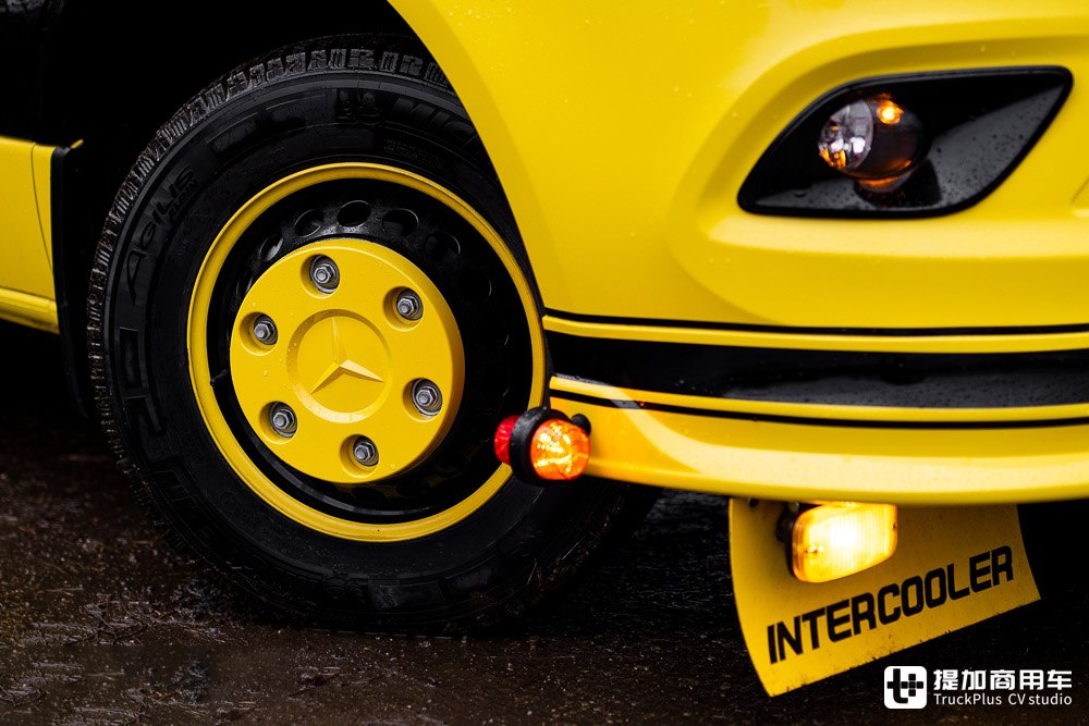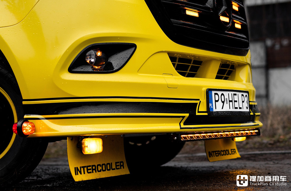 灯光不止于此,还有保险杠下方安装的条形LED射灯以及前向黄色照明灯、两侧安装的示廓灯。并且,车辆还配备了新的黄色挡泥板,INTERCOOLER字样颇有复古风味。