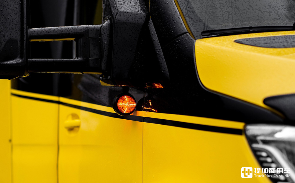 并且,驾驶室后墙上还安装了倒车摄像头,车顶带有超薄款告警灯