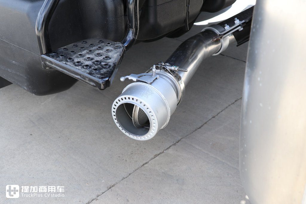 危险品运输车虽然取消了前置排气筒,但是为了安全起见还是要配备消火帽的,奔驰Actros在这方面的做法是延长排气管+原厂阀门式消火帽,尽最大可能避免火星产生,保证运输安全性。