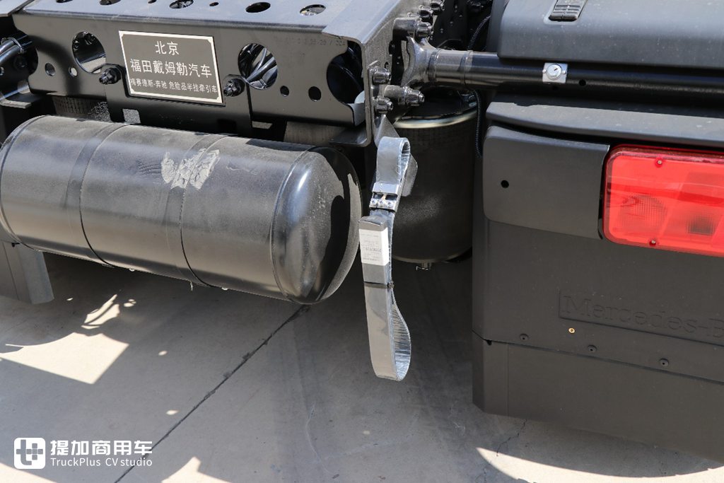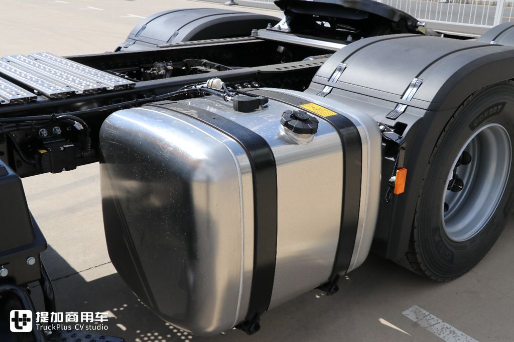 在国标GB7258当中要求,危险货物运输货车应装备单燃油箱,且单燃油箱的容积应小于等于 400L,奔驰Actros为了更好的适应危化品运输工作,增加了原厂400L的铝合金油箱配置,在合规的前提下满足用户最大续航能力要求。