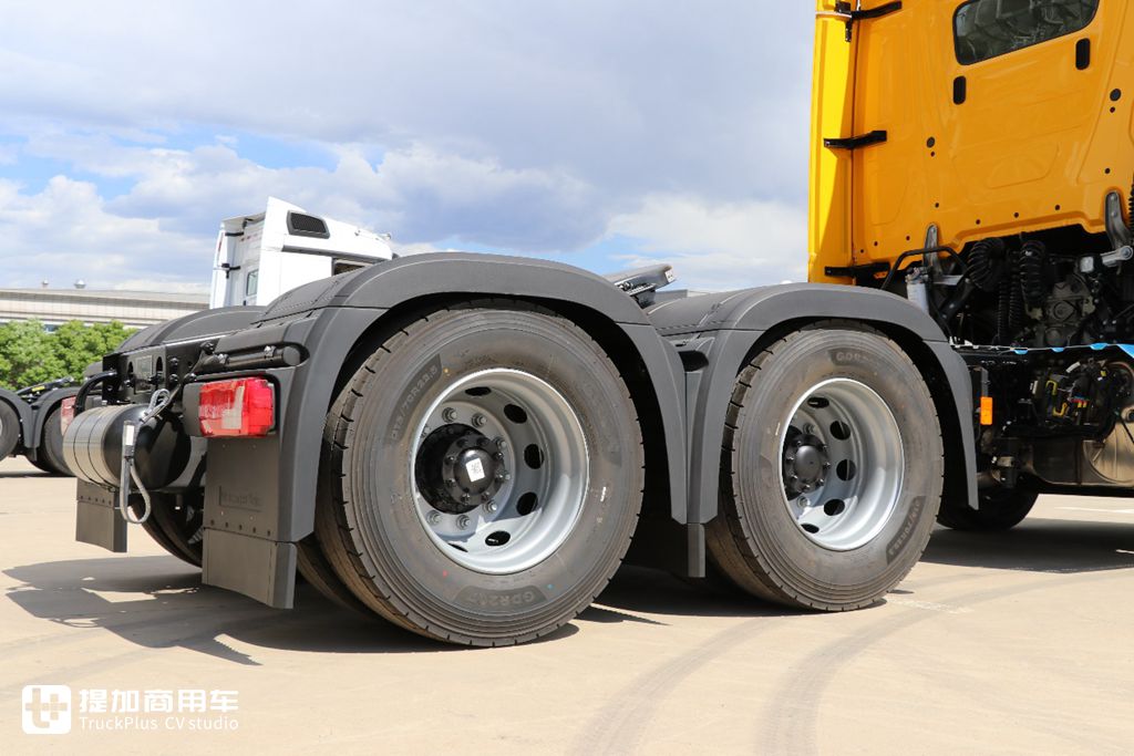 因为是危险品车型,所以车辆采用了6X4后双驱的配置,为了提升车辆的脱困能力,奔驰为此配备了轴间差速锁和轮间差速锁。