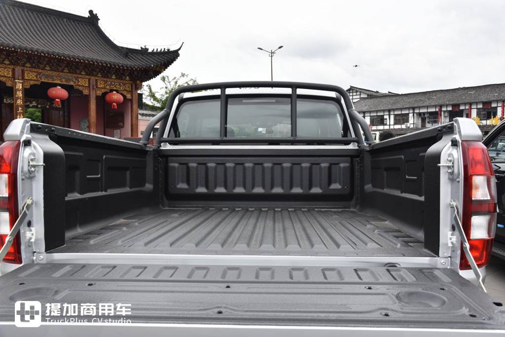 车侧线条流畅,尾灯依旧采用带有鲜明皮卡特色的竖直排列设计。下方保险杠同样采用黑色磨砂质感的设计,提升了关键部分的防刮性能从而降低了维修成本。货厢尾门金属折痕式的设计使细节感拉满,进一步凸显整体硬汉风格。