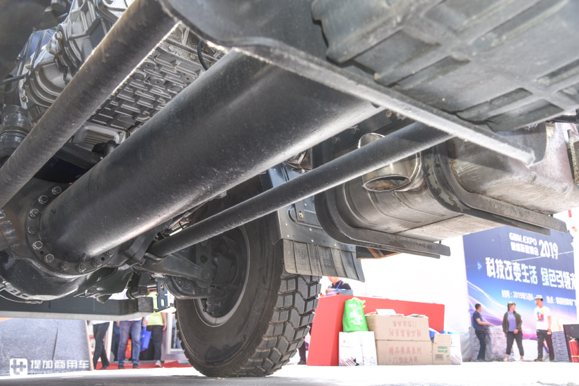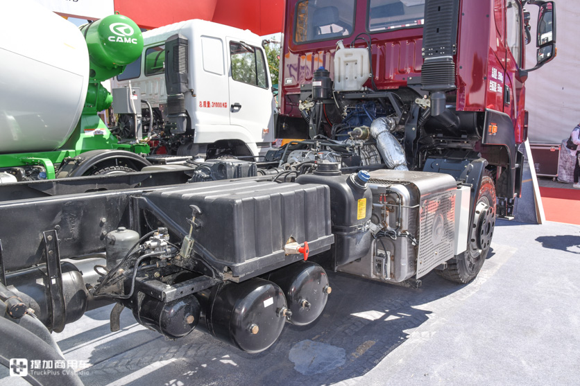 底盘右侧就是国产车常见的搭配了,从前到后依次为后处理系统,尿素箱,蓄电池、储气筒,压缩空气干燥罐。