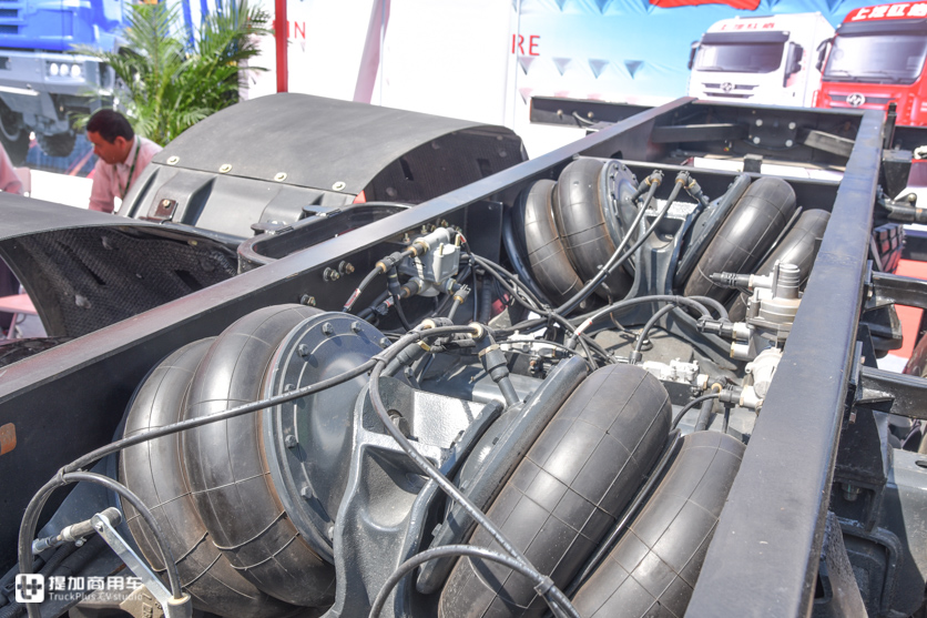 后桥13吨级单减桥,速比3.385,摆动式车桥。悬架结构比较特殊,上面是气囊减震,下面还有平衡轴钢板弹簧,长征称之为复合悬架。这种布局会影响独立悬架的性能,优点是能兼顾重载需求。