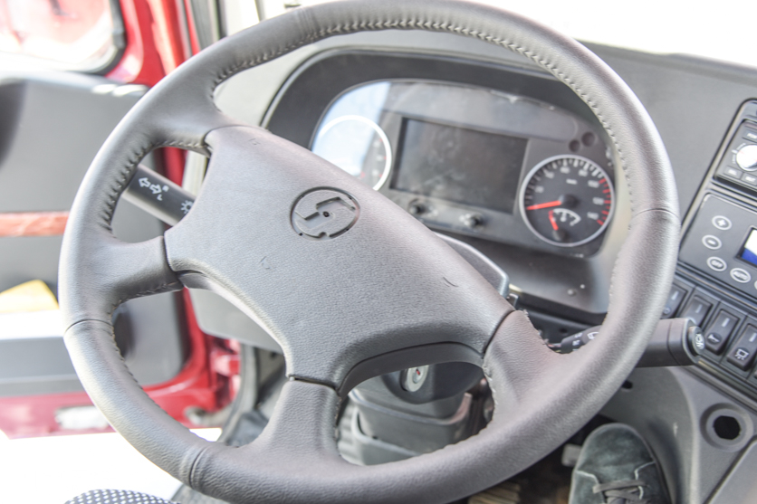 方向盘用的是陕汽德龙M3000同款,上面还有陕汽标抠走留下的痕迹。