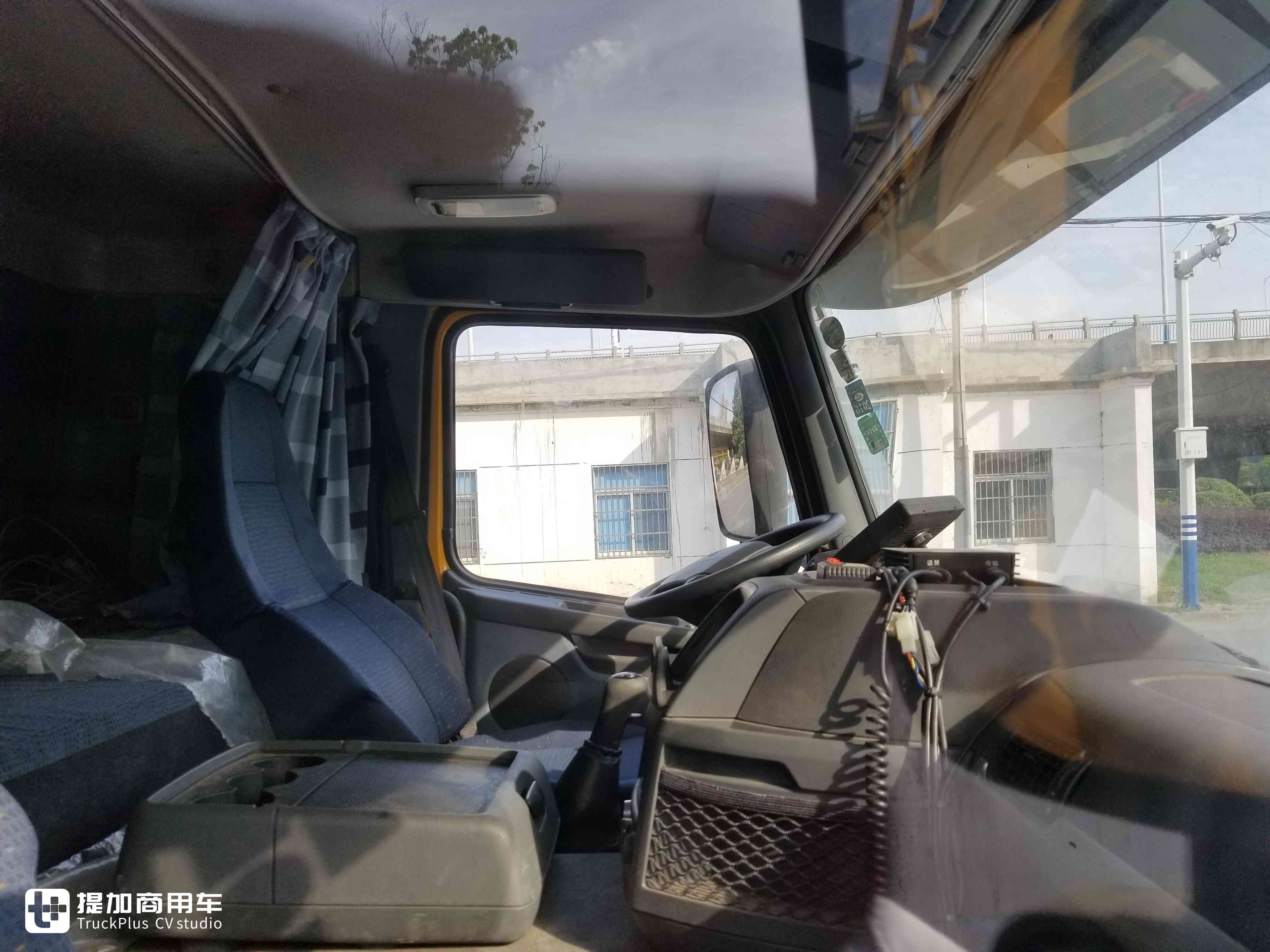 内饰是很经典的上一代沃尔沃设计风格,仪表台的储物空间较为丰富,驾驶员位置前方和侧方分别配有一个遮阳板,蓝色气囊减震座椅一旁便是双预选阀的12速手动变速箱的档把,中央凸起的地板上方装有一个储物箱,可用于放置水杯和一些杂物,后方卧铺丝毫不逊于当下主流牵引车的水平。
