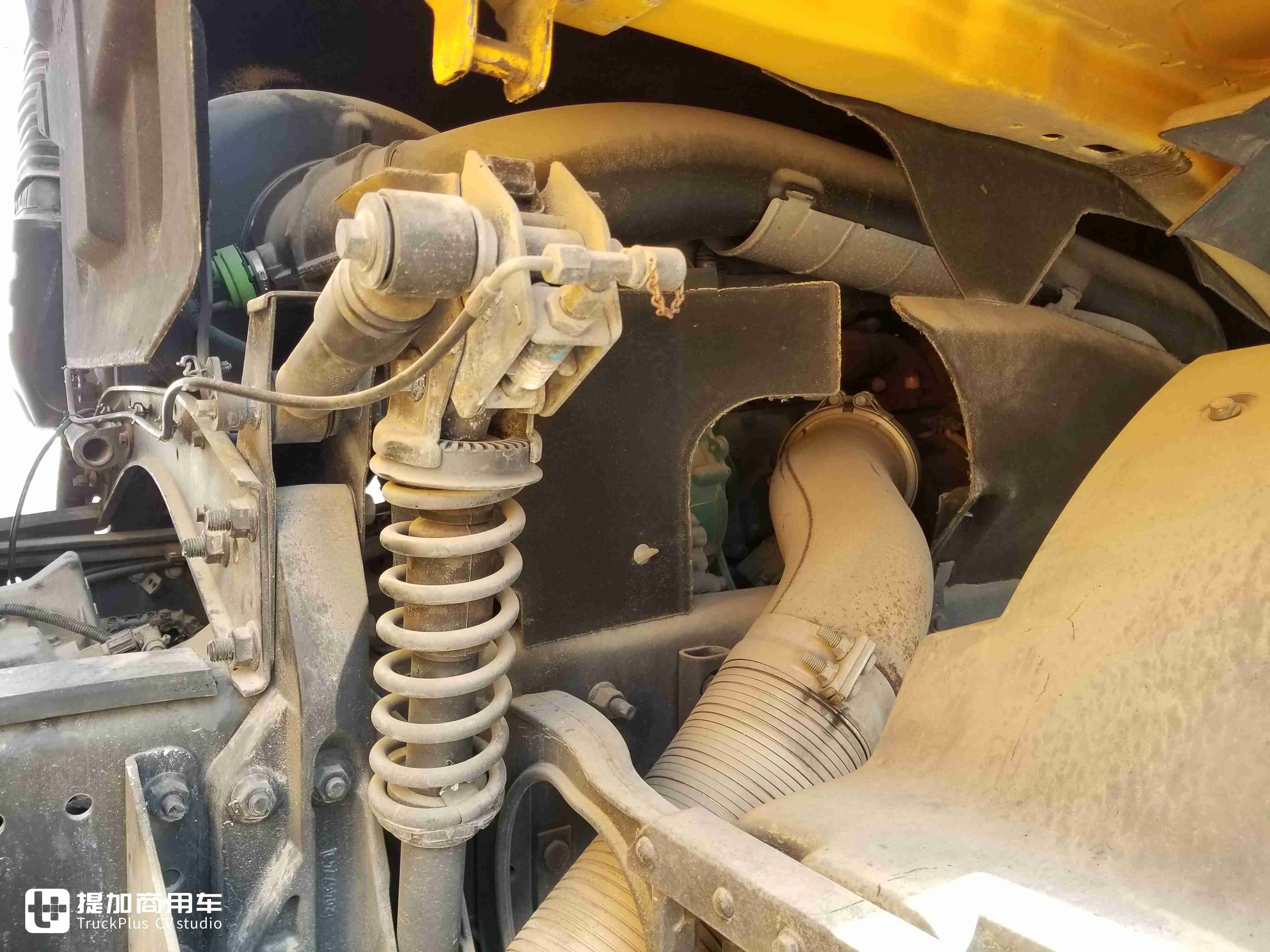 从以下两图能够看出该车驾驶室采用前后螺旋弹簧减震,相比时下流行的气囊四点悬浮形式,弹簧减震耐久性更好,符合工程底盘的定位。前轮拱与发动机的中间严实的挡泥板不仅保护了发动机的清洁,其材料也可以有效隔音降噪。反观目前的国产重卡,少有车型在意这个细节,即便有挡泥板,也是面积较小的硬塑料,他们之间的差距就在这些细枝末节处得到体现。