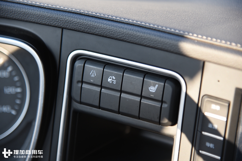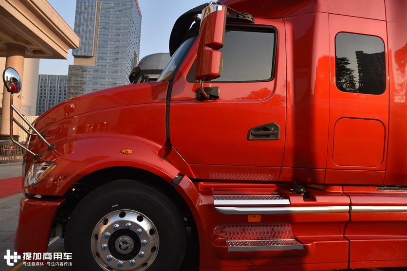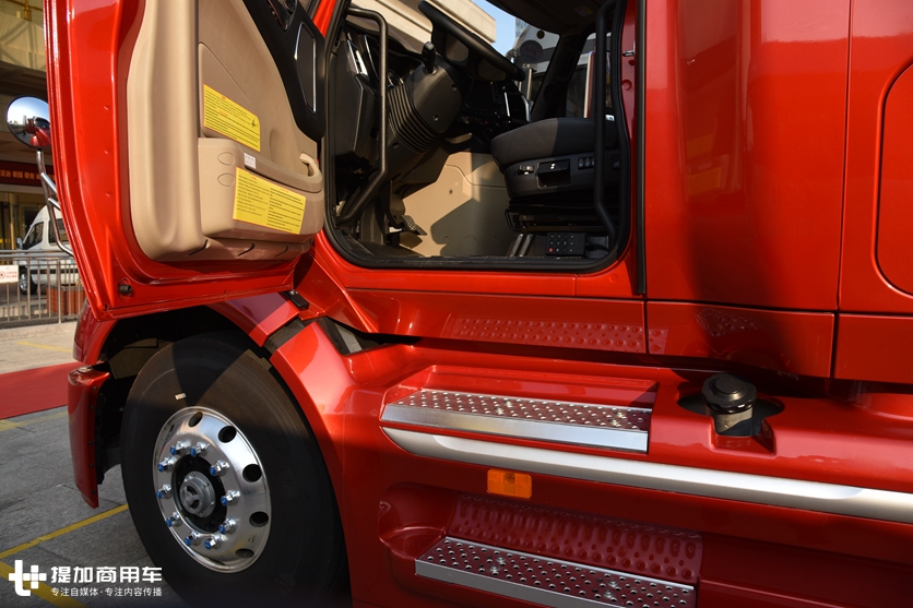 相对于平头卡车,V7在拥有纯平地板驾驶室的前提下,还有着更低的车身,蹬车踏板只有两级,可以很轻松上下车,而且蹬车踏板还镶嵌了铝合金防滑材质。
