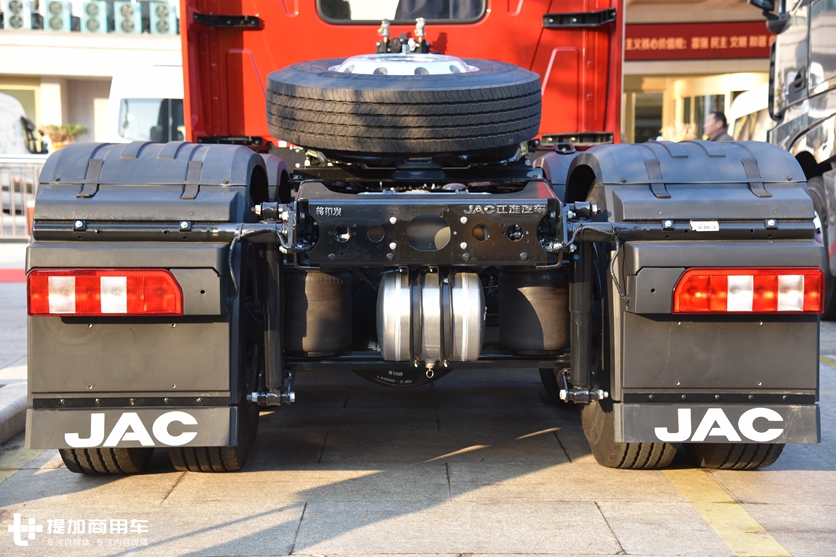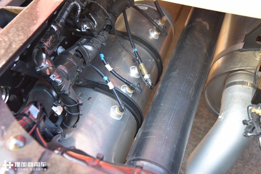 常规做法是采用少片钢板簧、铝合金轮圈、空气悬架、铝合金油箱500L+500L、铝合金储气筒、更多新型材料的使用以及横置推力杆结构,都为车身总质量减重不少。