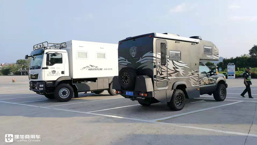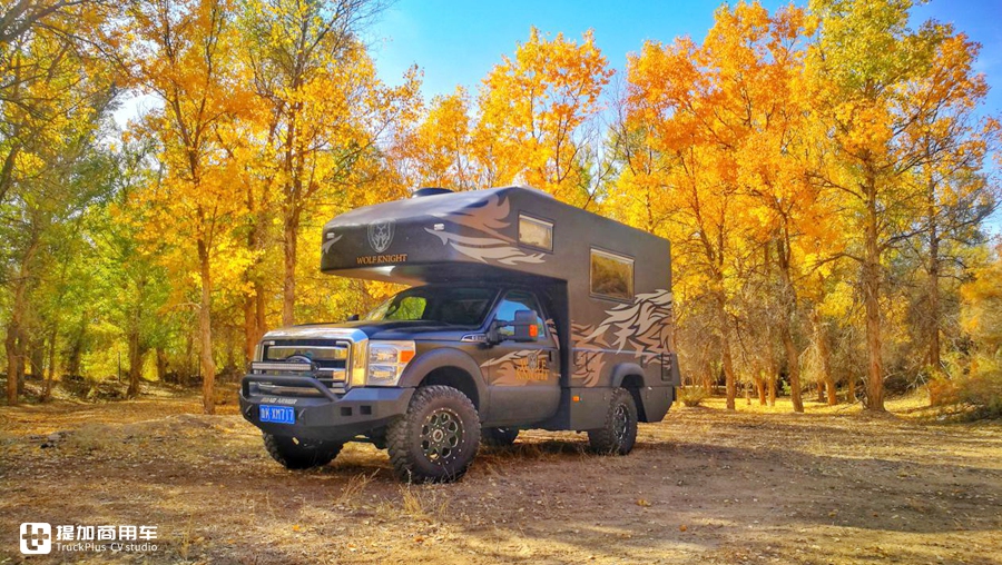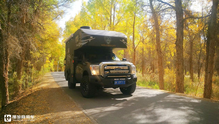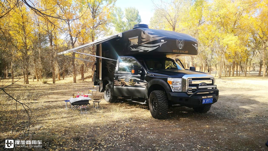 今天要给大家介绍的,就是由福特SUPER DUTY单排底盘打造的一款四驱狼骑士房车。