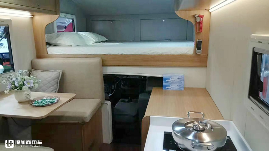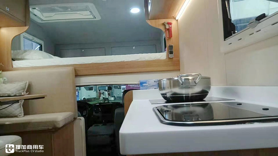 车内采用了经典布局,车头是额头双人床,中间左侧是会客区可供四个人乘坐,右侧便是厨房以及储物柜,厨房包含洗菜池,单眼电陶炉以及多美达110L冷藏+16L冷冻冰箱。