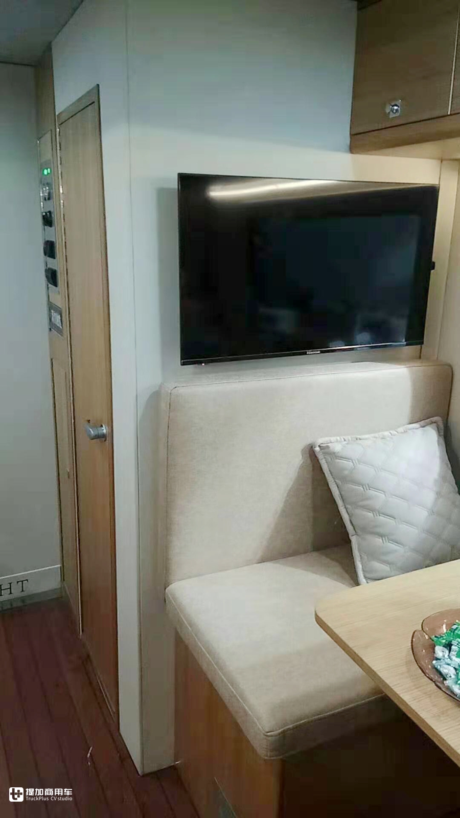 车辆尾部便是卫生间,配有进口赛特福德盒式坐便器以及沐浴系统,120L清水箱,55L灰水箱,水箱材质均为不锈钢。卫生间外部墙上还挂着一台卫星电视的显示屏,车顶有一个俗称大蘑菇的卫星天线,这套系统对于常年在信号不稳定的郊外是个很好的保障。