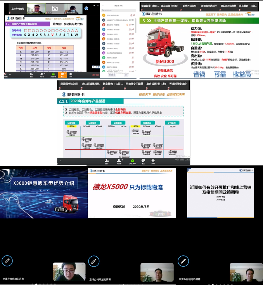 面对疫情过后市场面临的机遇与挑战,陕汽则积极加强渠道业务技能提升与多元化营销方式变革。通过实施陕汽商学院远程培训、抖音线上直播室推广和各类视频会议交流会等线上服务支持,全面统一目标与营销思路,为客户提供最优质的服务。陕汽京津办事处紧跟步伐,于3月15日在区域内通过网络授课的方式,从综合业务、国六天然气、自卸车、X3000、X5000、市场推广、数字营销等各方面对渠道业务人员进行综合培训。