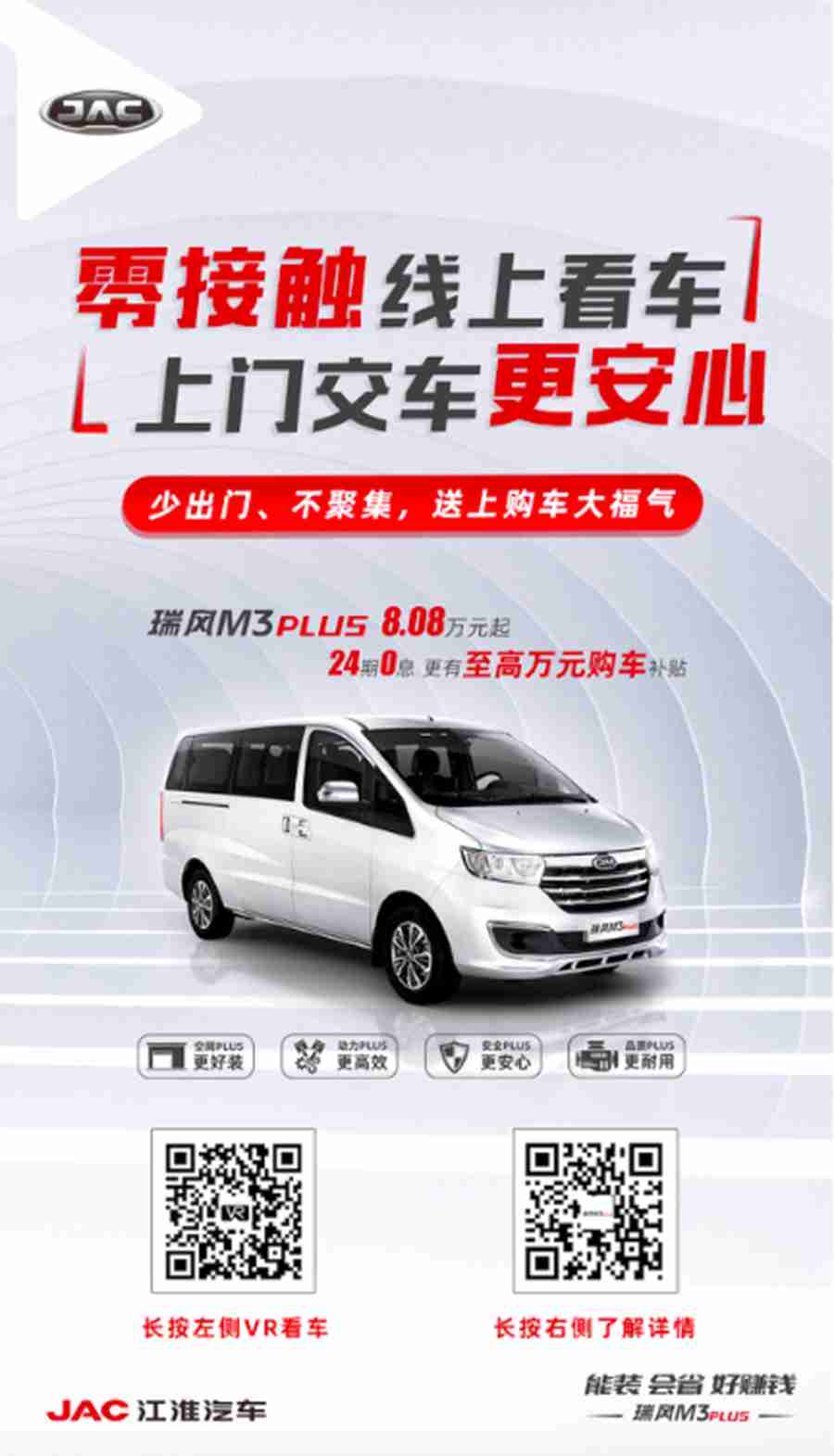 上半年受疫情影响,江淮商务车大力拓宽线上沟通渠道,采用多种渠道方式亲近消费人群。一方面,通过短视频、直播方式营销,江淮商务车输出了数千条短视频和开展了万余场直播,联接起超千万消费人群;另一方面,通过优化用户接触平台、数字化营销建设、线上预约上门试驾等,江淮商务车以更加精准的线上渠道进行用户沟通,实现了营销效果的强化。