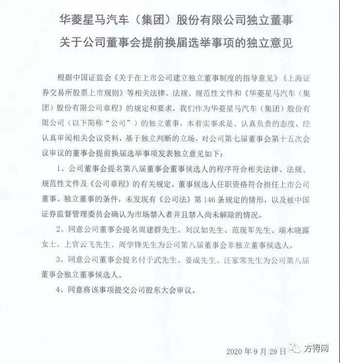 9月29日,华菱星马汽车集团股份有限公司(以下简称“公司”)发布独立董事发表独立意见公告。公告称,同意公司董事会提名周建群、刘汉如、范现军、端木晓露、上官云飞、周学锋为公司第八届董事会非独立董事候选人。同意公司董事会提名付于武(中国汽车工程学会名誉理事长、中国汽车人才研究会名誉理事长)、晏成(搜狐网副总编辑)、汪家常(安徽工业大学教授)为公司第八届董事会独立董事候选人。
