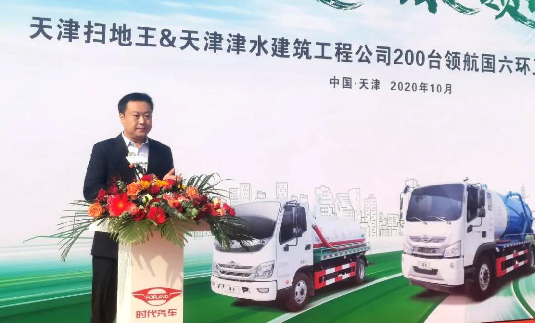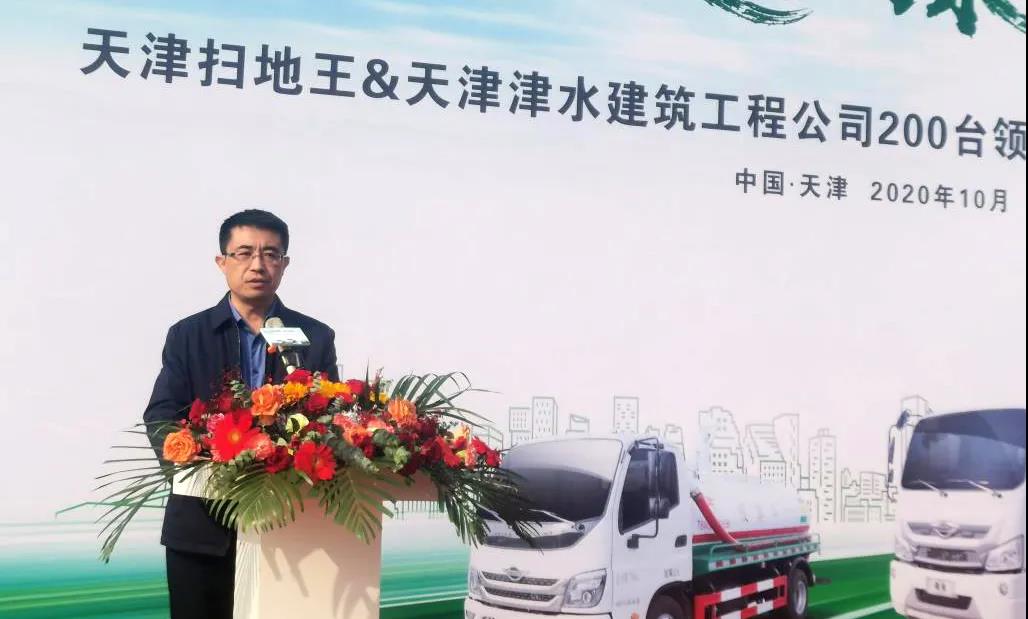 苏庆彬副总经理就三方合作发展做出致辞,他表示:扫地王公司是一家具有国家工信部批准的专用车生产、改装资质的企业。多年来公司不断加大设计研发力度,本次与时代汽车强强联合,首批交付200台时代领航。后续,有了时代国六环卫车的支持,扫地王集团将为天津市津水建筑工程有限公司提供更专业、更全面、更快速的一体化解决方案。期待三方再次合作,再创辉煌。